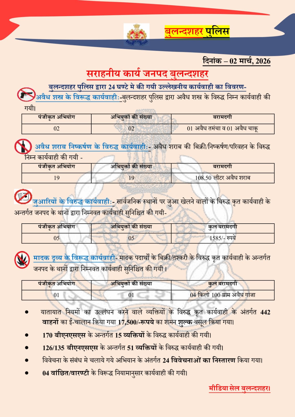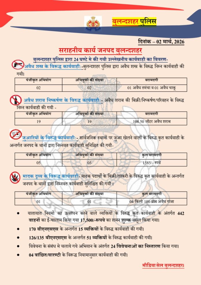 02/03/2026: जनपद बुलंदशहर में पुलिस की आज की कार्रवाई पर एक नजर