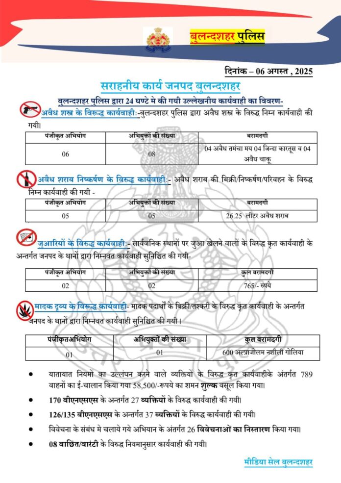 06/08/2025: जनपद बुलंदशहर में पुलिस की आज की कार्रवाई पर एक नजर