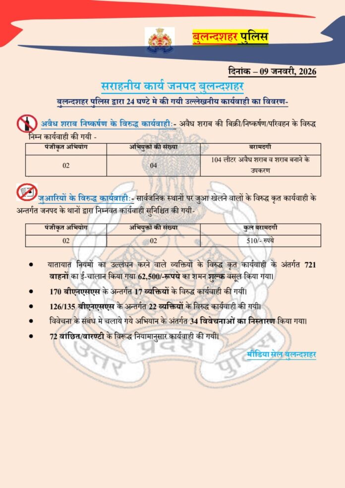09/01/2026: जनपद बुलंदशहर में पुलिस की आज की कार्रवाई पर एक नजर