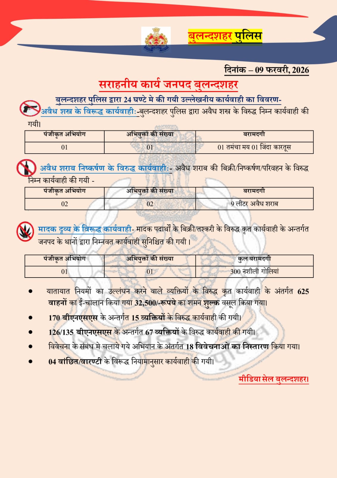 09/02/2026: जनपद बुलंदशहर में पुलिस की आज की कार्रवाई पर एक नजर