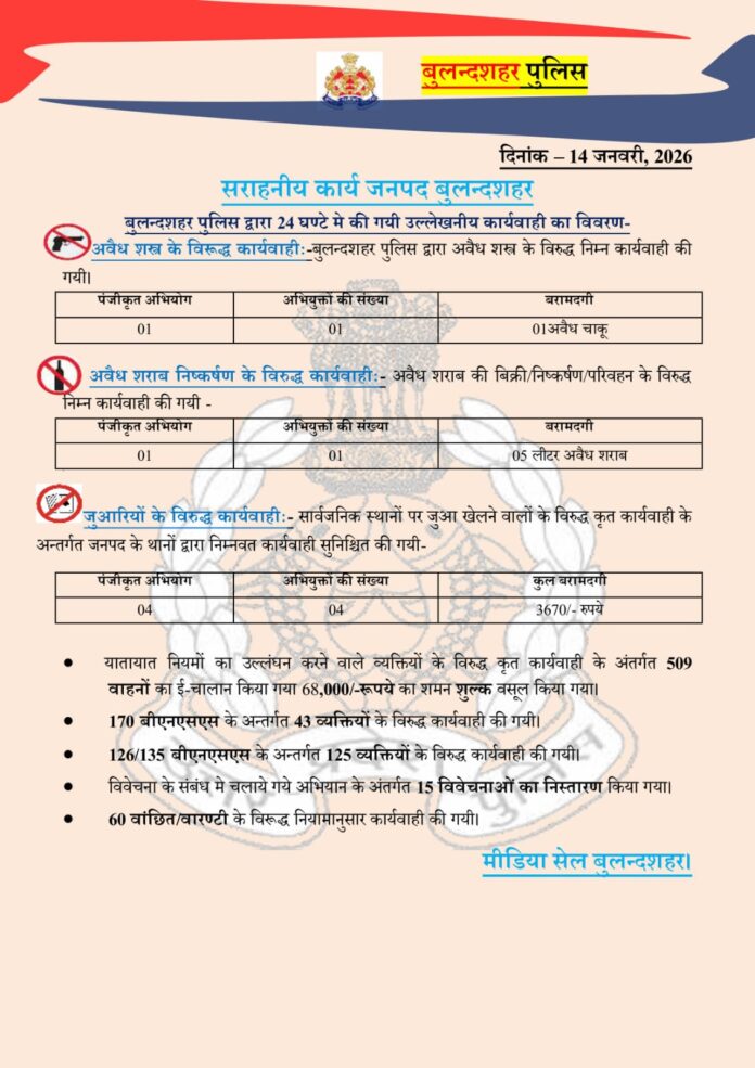 14/01/2026: जनपद बुलंदशहर में पुलिस की आज की कार्रवाई पर एक नजर