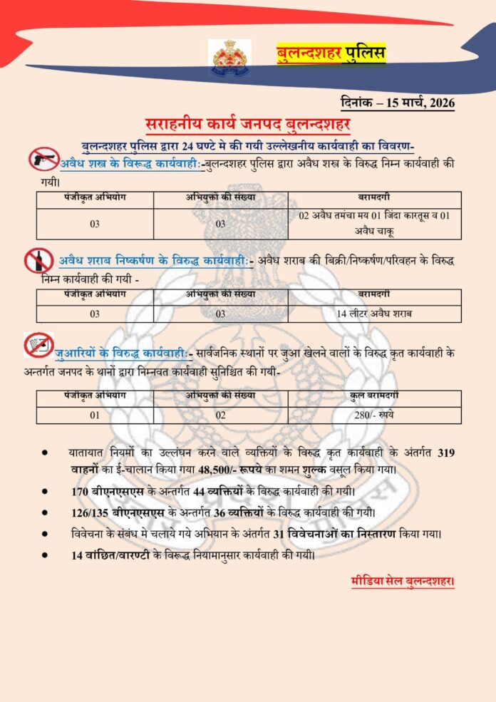 15/03/2026: जनपद बुलंदशहर में पुलिस की आज की कार्रवाई पर एक नजर