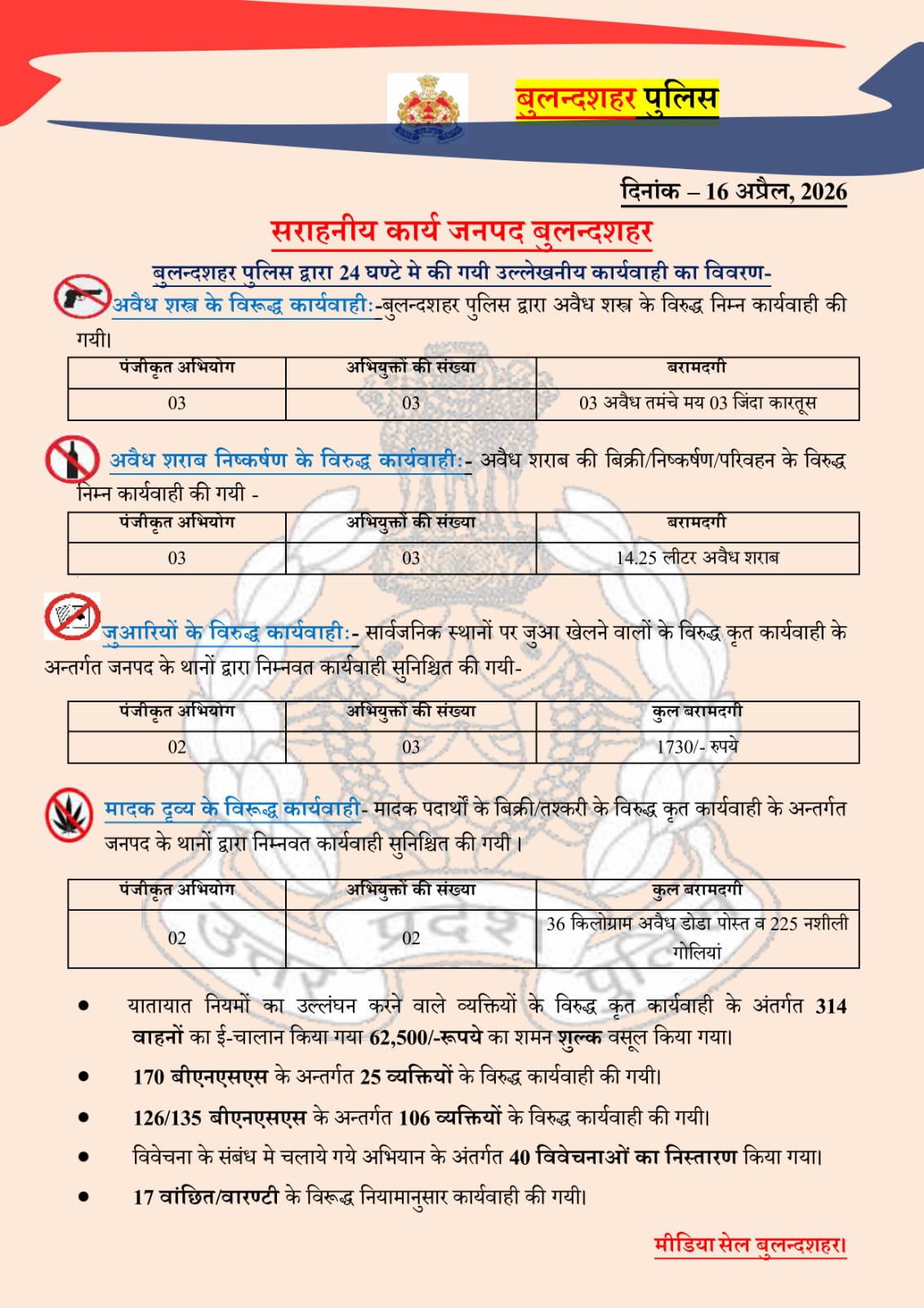 16/04/2026: जनपद बुलंदशहर में पुलिस की आज की कार्रवाई पर एक नजर
