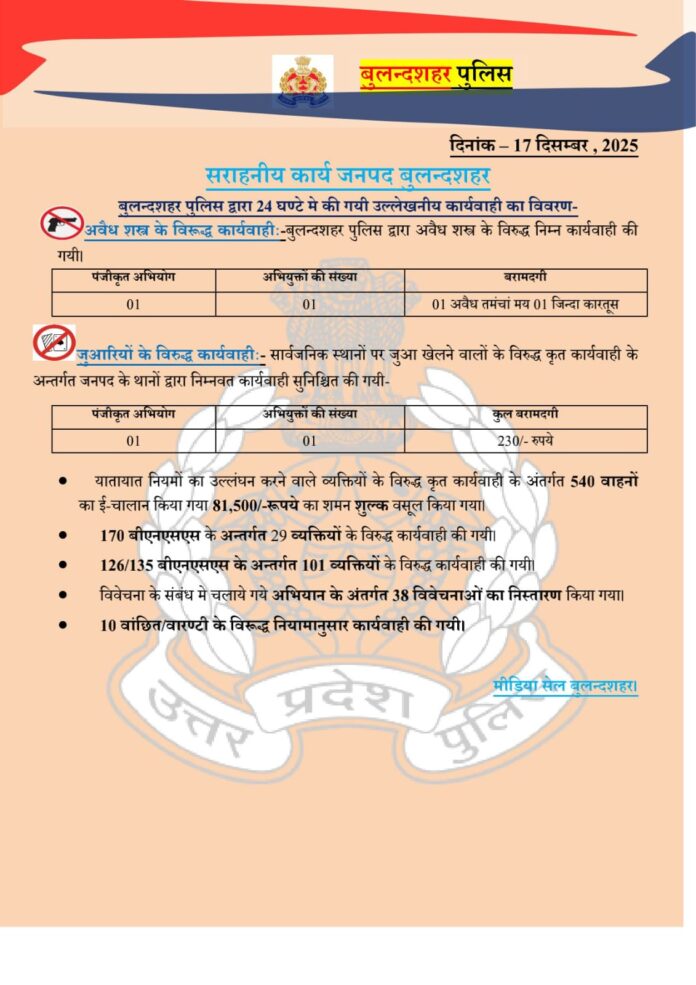 17/12/2025: जनपद बुलंदशहर में पुलिस की आज की कार्रवाई पर एक नजर