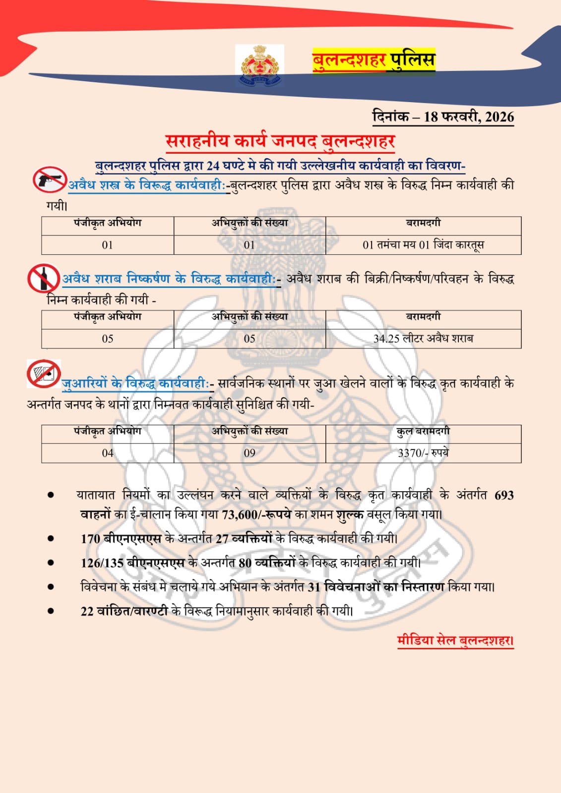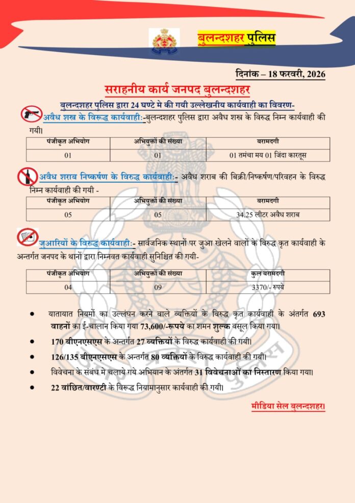 18/02/2026: जनपद बुलंदशहर में पुलिस की आज की कार्रवाई पर एक नजर