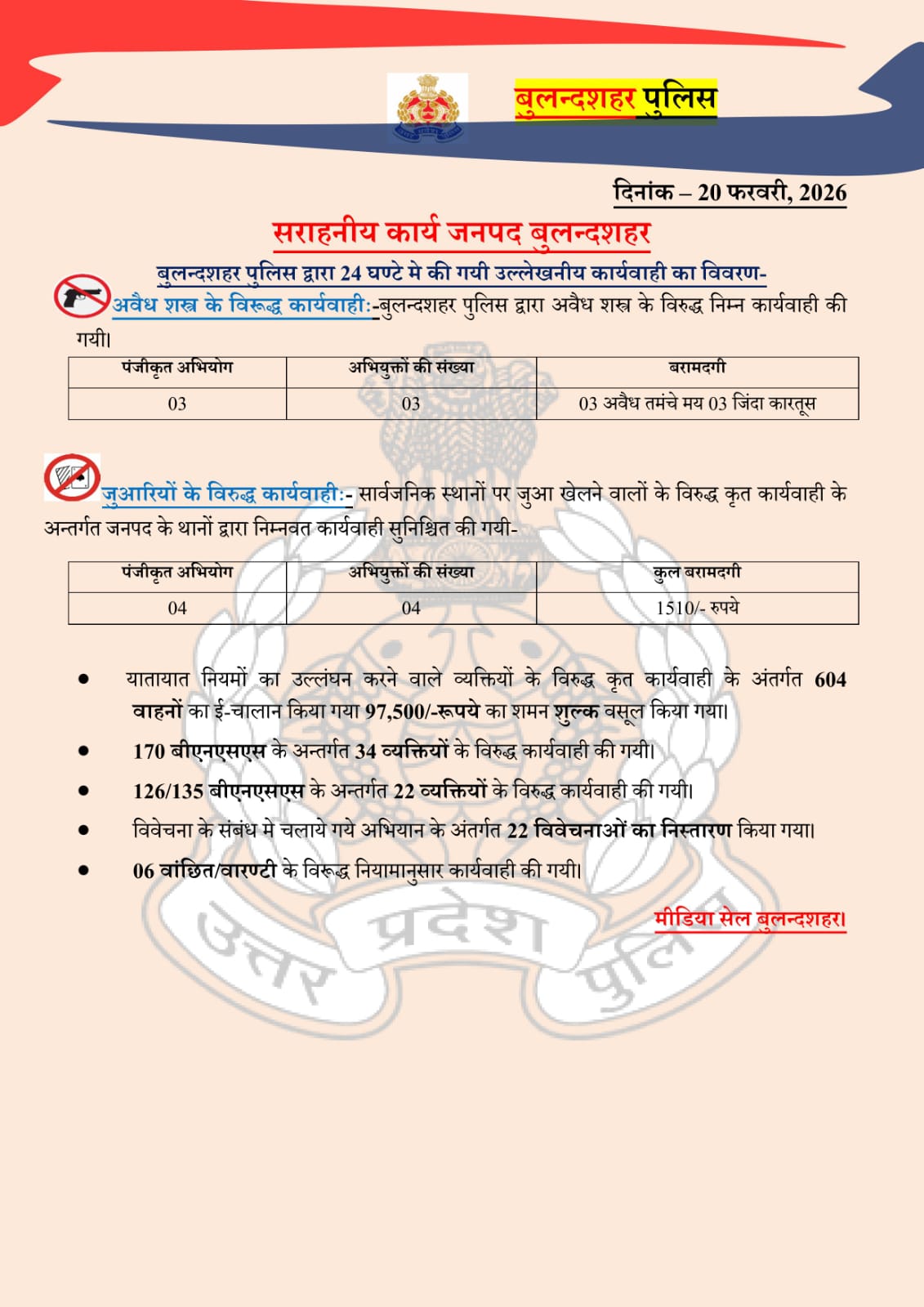 20/02/2026: जनपद बुलंदशहर में पुलिस की आज की कार्रवाई पर एक नजर