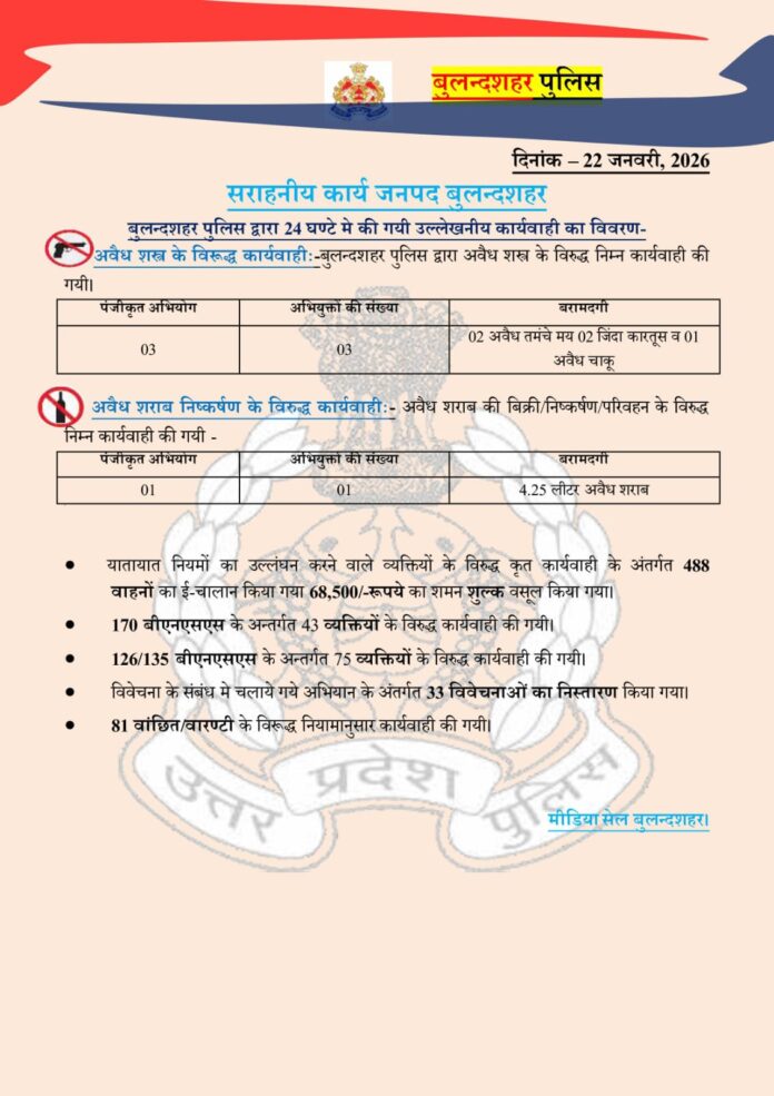 22/01/2026: जनपद बुलंदशहर में पुलिस की आज की कार्रवाई पर एक नजर