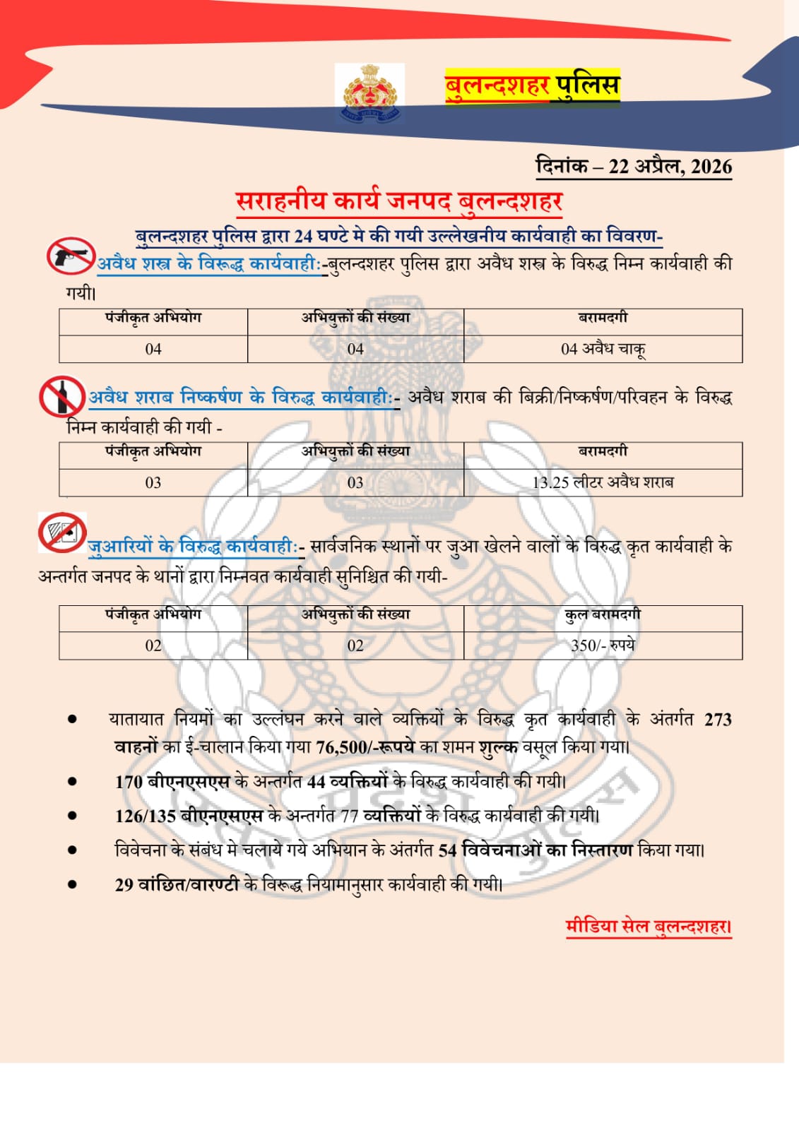 22/04/2026: जनपद बुलंदशहर में पुलिस की आज की कार्रवाई पर एक नजर