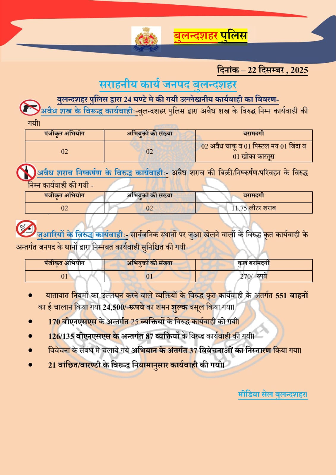 22/12/2025: जनपद बुलंदशहर में पुलिस की आज की कार्रवाई पर एक नजर