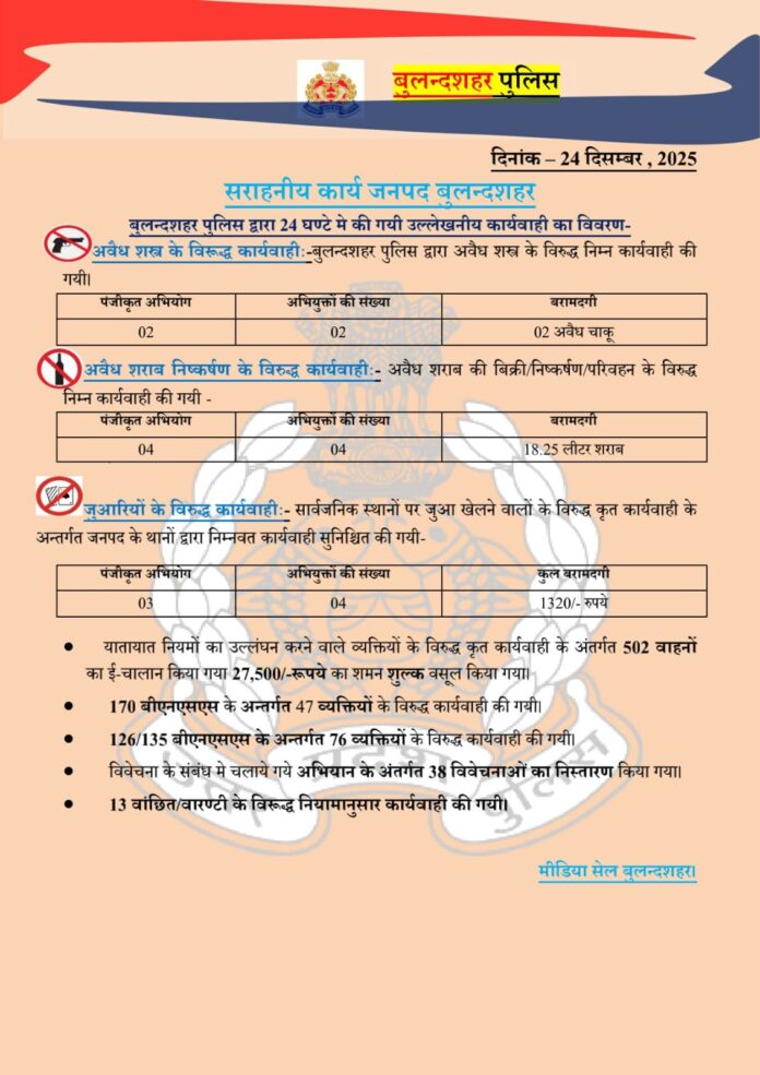 24/12/2025: जनपद बुलंदशहर में पुलिस की आज की कार्रवाई पर एक नजर