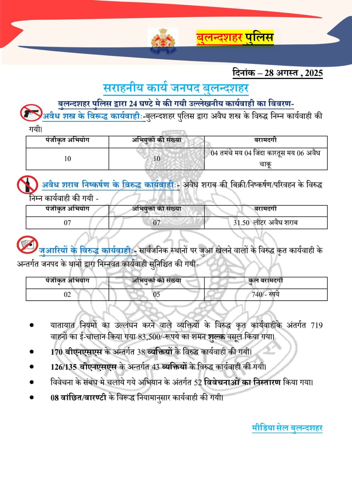 28/08/2025: जनपद बुलंदशहर में पुलिस की आज की कार्रवाई पर एक नजर