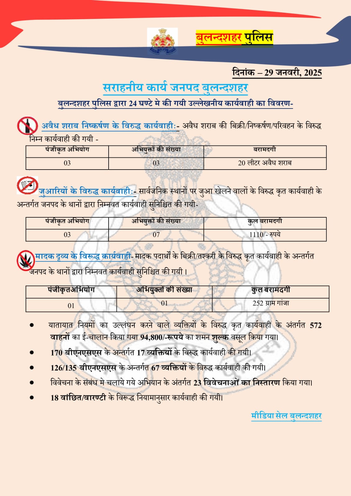 29/01/2026: जनपद बुलंदशहर में पुलिस की आज की कार्रवाई पर एक नजर