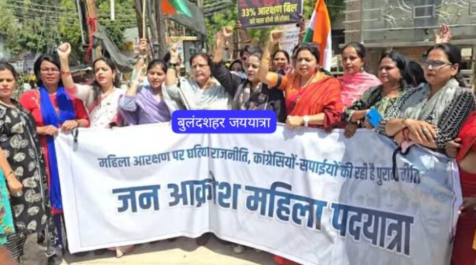 बुलंदशहर, डेस्क (जय यात्रा): जनपद बुलंदशहर में नारी शक्ति वंदन अधिनियम से संबंधित संविधान संशोधन विधेयक को पारित होने से रोकने के विरोध में बुधवार को भाजपा नेत्रियों ने सड़क पर उतरकर प्रदर्शन किया। इस महत्वपूर्ण विधेयक को विफल कर विपक्षी गठबंधन ने लोकसभा और राज्य विधानसभा में महिलाओं को 33 प्रतिशत आरक्षण देने की प्रक्रिया को बाधित किया है। साथ ही कहा कि यह पांचवीं बार है जब इस गठबंधन ने महिला आरक्षण को रोका है और इतिहास में पहली बार कांग्रेस ने सीधे तौर पर महिला आरक्षण के प्रस्ताव के खिलाफ मतदान किया है। प्रदर्शनकारी हाथों में बैनर व तख्तियां लिए थे।
