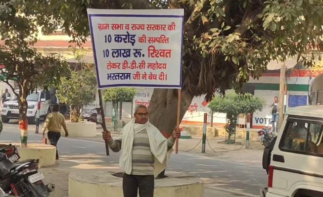 बुलंदशहर, डेस्क (जय यात्रा): जनपद बुलंदशहर में एक व्यक्ति हाथों में रिश्वतखोरी के आरोपों वाला बैनर लेकर सोमवार को सीधे कलेक्ट्रेट परिसर पहुंच गया। फरियादी ने डीडीसी पर 10 लाख रुपये की रिश्वत लेने और ग्राम समाज की कीमती भूमि का फैसला दूसरे पक्ष के हक में सुनाने का गंभीर आरोप लगाया।