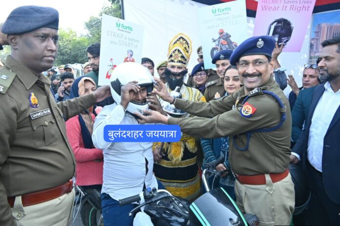 बुलंदशहर, डेस्क (जय यात्रा): सड़क दुर्घटनाओं को रोकने के लिए एवं वाहन चालकों को यातायात नियमों का पालन करने हेतु जागरूक करने के लिए सोमवार को बुलंदशहर जिले के काला आम चौराहे पर यातायात पुलिस के द्वारा फोर्टिस हॉस्पिटल ग्रेटर नोएडा के साथ एक कार्यक्रम का आयोजन किया गया। कार्यक्रम में जिलाधिकारी श्रुति व एसएसपी दिनेश कुमार सिंह ने प्रतिभाग करते हुए वाहन चालकों से यातयात नियमों का पालन करने की अपील की। इस मौके पर बिना हेलमेट आने वाले बाइक सवार लोगों को जिलाधिकारी व एसएसपी द्वारा हेलमेट वितरित करते हुए कहा कि बाइक चलाते समय हेलमेट अवश्य पहने। जीवन अनमोल है इसलिए उसकी सुरक्षा के लिए नियमों का पालन अवश्य करें। इस बात का ध्यान रखें कि घर से दुपहिया वाहन पर निकलते समय हेलमेट का प्रयोग जरूर करें। इस अवसर पर एसपी सिटी शंकर प्रसाद, एसपी देहात डॉ. तेजवीर सिंह, एएसपी ऋजुल, सीओ ट्रैफिक सहित प्रभारी निरीक्षक कोतवाली नगर, ट्रैफिक इंस्पेक्टर, फोर्टिस हॉस्पिटल के प्रतिनिधि उपस्थित रहे।