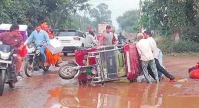 सड़क पर बने गड्डों में गिरी ई-रिक्शा, धान भी भीगा