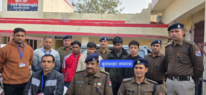 बुलंदशहर, डेस्क (जय यात्रा): जनपद बुलंदशहर में खुर्जा जंक्शन पुलिस ने चलती ट्रेन से सामान चोरी करने वाले अंतरराज्यीय चोर गिरोह का भंडाफोड़ किया है। आरपीएफ और सीआरपीएफ की संयुक्त टीम ने गिरोह के चार शातिर सदस्यों को गिरफ्तार करते हुए उनके कब्जे से करीब 60 हजार रुपये कीमत के रेडीमेड कपड़े और चोरी में प्रयुक्त कार बरामद की है। पुलिस अब फरार एक अन्य आरोपी की तलाश में जुटी हुई है।