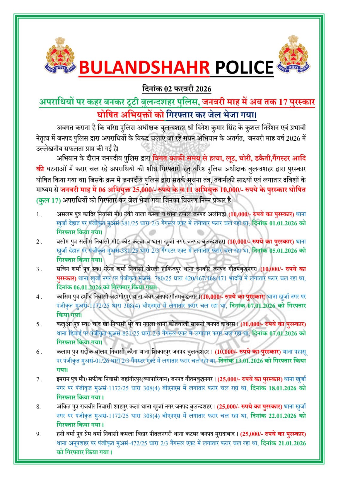 अवगत कराना है कि वरिष्ठ पुलिस अधीक्षक बुलन्दशहर श्री दिनेश कुमार सिंह के कुशल निर्देशन एवं प्रभावी नेतृत्व में जनपद पुलिस द्वारा अपराधियों के विरुद्ध चलाए जा रहे सघन अभियान के अंतर्गत, जनवरी माह वर्ष 2026 में उल्लेखनीय सफलता प्राप्त की गई है।