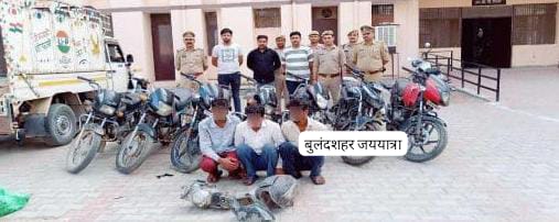 बुलंदशहर, डेस्क (जय यात्रा): जनपद बुलंदशहर के थाना सिकंदराबाद पुलिस ने बुधवार को चेकिंग के दौरान गूर्जर चौक से अंतर्राजीय शातिर वाहन चोरों को गिरफ्तार किया है जिनकी निशान देही पर चोला रोड पर बंद पड़ी फैक्ट्री के पास से आठ मोटरसाइकिल व अवैध असलहा कारतूस बरामद हुए है। गिरफ्तार आरोपियों की पहचान चांद मौहम्मद पुत्र मुख्तार निवासी खोदना कला थाना सूरजपुर जनपद गौतमबुद्धनगर, साजिद पुत्र अयूब निवासी खोदना कला थाना सूरजपुर जनपद गौतमबुद्धनगर तथा वकील पुत्र रसीद निवासी फतेहपुर अट्टा थाना दनकौर जनपद गौतमबुद्धनगर के रूप में हुई है। पुलिस ने बताया कि गिरफ्तार आरोपी शातिर किस्म के अन्तर्राजीय वाहन चोर हैं। जिनके द्वारा दिल्ली, मेरठ, हापुड, बुलन्दशहर व एनसीआर क्षेत्र में मोटरसाइकिल चोरी की जाती है तथा उनके पार्टस को अलग-अगल कर बेचे देते हैं, जो पैसे मिलते हैं उन्हें आपस में बांट लेते हैं। अभियुक्तों के कब्जे से बरामद 04 मोटरसाइकिल को ट्रेस किया गया हैं तथा अन्य 04 को ट्रैस करने का प्रयास किया जा रहा हैं। गिरफ्तार आरोपियों द्वारा बरामद मोटरसाइकिल को दिल्ली से चोरी किया गया था। जिसके सम्बन्ध में क्राइम ब्रान्च दिल्ली में ई एफआईआर 24285/25 पंजीकृत है। गिरफ्तार आरोपियों द्वारा बरामद मोटरसाइकिल को दिल्ली से चोरी किया गया था। जिसके सम्बन्ध में क्राइम ब्रान्च दिल्ली में ई एफआईआर 9197/25 पंजीकृत है। गिरफ्तार अभियुक्तों द्वारा 01 मोटरसाइकिल एचएफ डीलेक्स के पार्टस (कटी हुई) व 01 मोटरसाइकिल स्प्लेंडर के पार्टस (कटी हुई) को जनपद बुलन्दशहर में थाना सिकन्द्राबाद क्षेत्र से चोरी किया गया था। जिनके सम्बन्ध में थाना सिकन्द्राबाद पर क्रमशः मुअसं- 918/25 धारा 303(2) बीएनएस व मुअसं-930/25 धारा 303 (2) बीएनएस पंजीकृत हैं। पुलिस ने तीनों आरोपियों को जेल भेज दिया है।