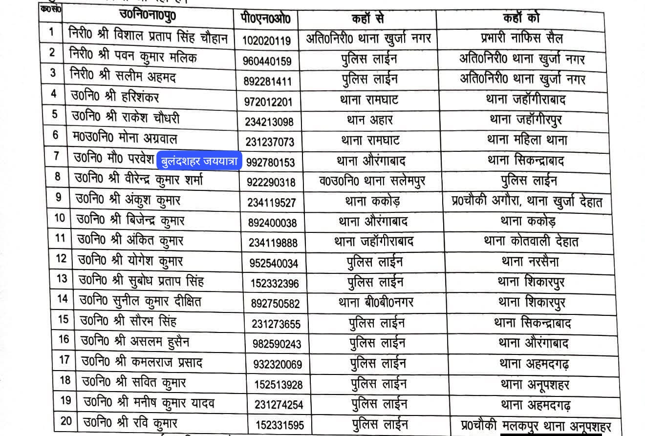 बुलंदशहर में बड़ा पुलिस फेरबदल: 20 उपनिरीक्षक व निरीक्षक इधर से उधर