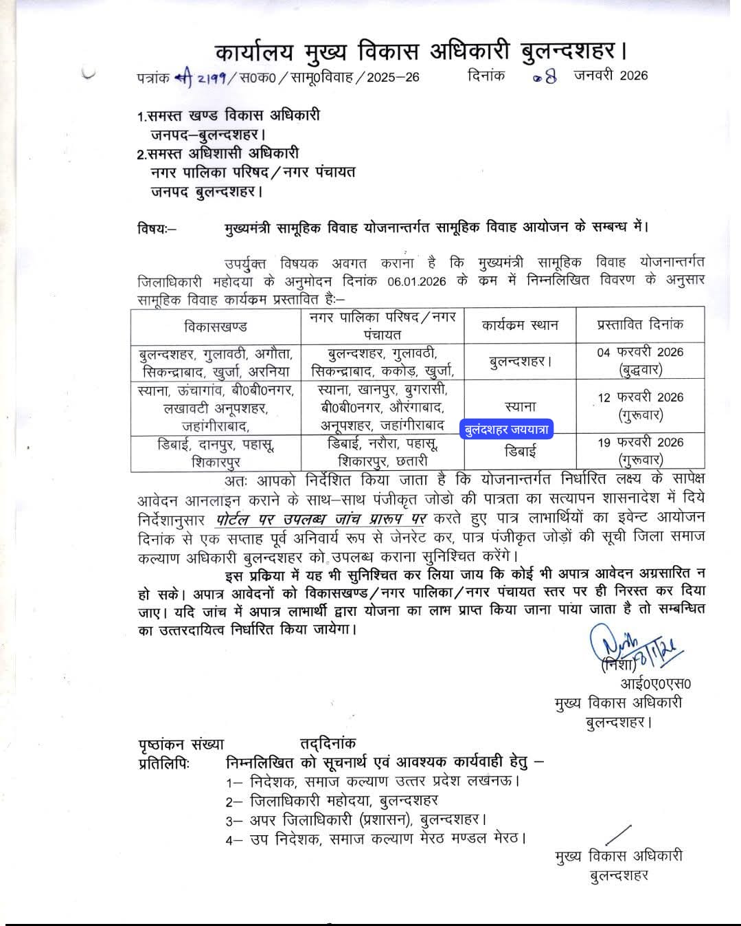 बुलंदशहर, डेस्क (जय यात्रा): मुख्यमंत्री सामूहिक विवाह योजना के अंतर्गत सामूहिक विवाह का आयोजन किया जा रहा है। कार्यालय मुख्य विकास अधिकारी बुलंदशहर ने आदेश जारी किया है। 4 फरवरी 2026 को विकासखंड बुलंदशहर, गुलावठी, अगौता, सिकंदराबाद, खुर्जा व अरनिया का कार्यक्रम स्थान बुलंदशहर है। 12 फरवरी 2026 को विकासखंड स्याना, ऊंचागांव, बी.बी.नगर, लखावटी अनूपशहर, जहांगीराबाद का कार्यक्रम स्थान स्याना है। वहीं 19 फरवरी 2026 को विकासखंड डिबाई, दानपुर, पहासू, शिकारपुर का कार्यक्रम स्थान डिबाई है। अधिक जानकारी के लिए देखें।