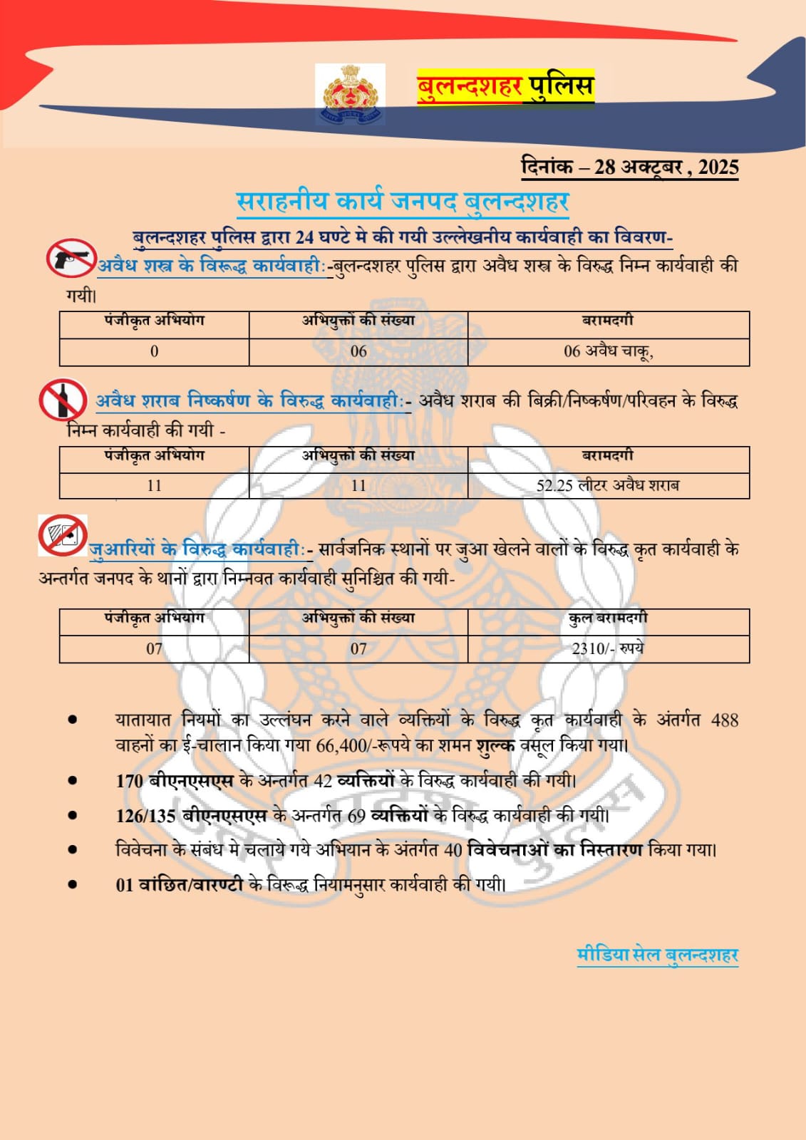 28/10/2025: जनपद बुलंदशहर में पुलिस की आज की कार्रवाई पर एक नजर
