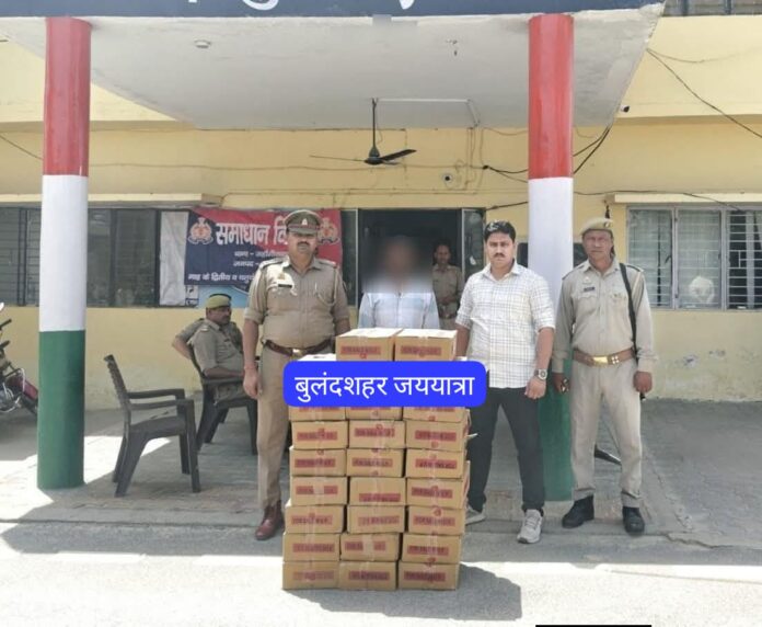 बुलंदशहर, डेस्क (जय यात्रा): वरिष्ठ पुलिस अधीक्षक दिनेश कुमार सिंह के कुशल निर्देशन में जनपद में अपराधों पर अंकुश लगाये जाने हेतु अपराधियो के विरूद्ध चलाये जा रहे अभियान के तहत शनिवार को थाना जहांगीराबाद पुलिस द्वारा एक अभिसूचना पर एक शातिर शराब तस्कर को अनूपशहर रोड स्थित एक कमरें से गिरफ्तार किया है जिसके कब्जे से पुलिस को 26 पेटी अवैध देशी शराब बरामद हुई है। गिरफ्तार आरोपी की पहचान प्रवीन पुत्र डूंगर निवासी ग्राम गहना थाना जहांगीराबाद जनपद बुलन्दशहर के रूप में हुई है। पुलिस ने आरोपी को जेल भेज दिया है।