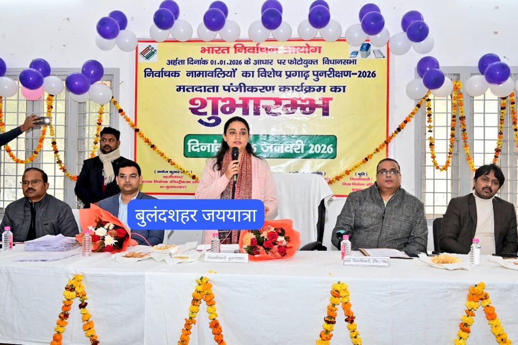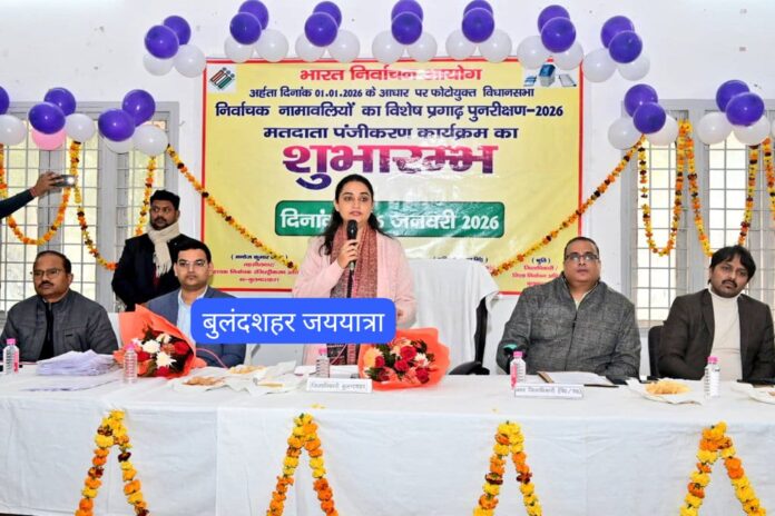 बुलंदशहर, डेस्क (जय यात्रा): जनपद बुलंदशहर में भारत निर्वाचन आयोग के निर्देशानुसार 01 जनवरी 2026 के आधार पर फोटोयुक्त विधानसभा निर्वाचक नामावलियों का विशेष प्रगाढ़ पुनरीक्षण कार्यक्रम के अंतर्गत जिला निर्वाचन अधिकारी/जिलाधिकारी श्रुति ने डीएवी इंटर कॉलेज में आयोजित कार्यक्रम में मतदाता पंजीकरण कार्यक्रम का फीता काटकर एवं मां सरस्वती की प्रतिमा पर दीप प्रज्ज्वलित कर शुभारंभ किया। कार्यक्रम में उपस्थित बीएलओ, सुपरवाइजर को संबोधित करते हुए जिलाधिकारी ने सभी को बधाई देती हुए कहा कि एसआईआर के कार्य में सभी के टीम के रूप में कार्य करते हुए कार्य को पूरा किया। शुद्ध निर्वाचन नामावली को तैयार करने में सभी की मेहनत है। बीएलओ, सुपरवाइजर द्वारा कार्य को पूरी निष्ठा, ईमानदारी से किया गया है। मतदाता सूची को डिजिटाइज कर तैयार किया गया है। इस अभियान का उद्देश्य त्रुटि रहित मतदाता सूची तैयार करना, पात्रों के नाम सूची में जोड़ने एवं अपात्रों के नाम सूची से हटाना है। सभी बीएलओ दावे, आपत्तियों को प्राप्त कर उनका निस्तारण समय से करें। कार्यक्रम में सराहनीय कार्य करने वाले बीएलओ को प्रमाण पत्र देकर सम्मानित भी किया गया।