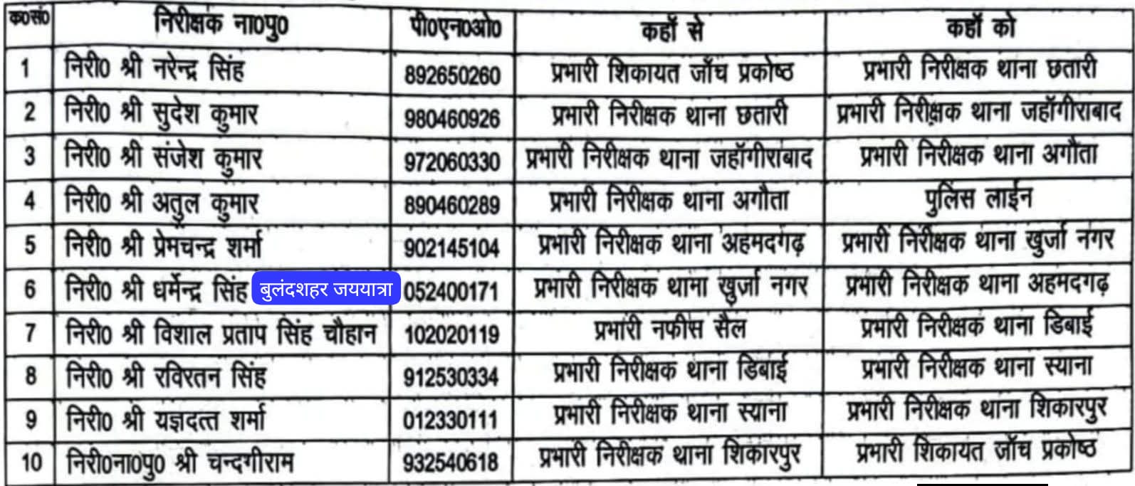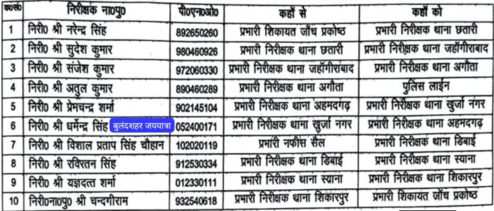 बुलंदशहर, डेस्क (जय यात्रा): जनपद बुलंदशहर के वरिष्ठ पुलिस अधीक्षक दिनेश कुमार सिंह ने रविवार को थाना प्रभारियों के कार्यों में फेरबदल किया हैं। बुलंदशहर जिले में तैनात दस निरीक्षकों के तबादले किए हैं। ये तबादले प्रशासनिक जरूरतों और कार्य व्यवस्था को बेहतर बनाने के उद्देश्य से किए गए हैं।