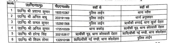 बुलंदशहर, डेस्क (जय यात्रा): जनपद बुलंदशहर के वरिष्ठ पुलिस अधीक्षक ने सोमवार को छह उप-निरीक्षकों के कार्यों में फेरबदल किए है। इस दौरान उन्होंने उपनिरीक्षक प्रशांत कुमार को पुलिस लाइन से थाना नरौरा, उपनिरीक्षक अनिल बाबू को पुलिस लाइन से थाना अनूपशहर, उपनिरीक्षक कमल कुमार को भी पुलिस लाइन से प्रभारी चौकी बगराई, थाना खुर्जा देहात और उपनिरीक्षक अनिल कुमार को थाना ककोड से प्रभारी चौकी भूड़, थाना कोतवाली देहात बनाया गया है। इसके आलावा उपनिरीक्षक हरेंद्र सिंह व उपनिरीक्षक शिवम तोमर का कार्य क्षेत्र भी बदला है।