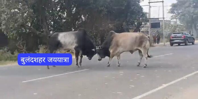 बुलंदशहर, डेस्क (जय यात्रा): जनपद बुलंदशहर के थाना अहमदगढ़ क्षेत्र के गांव मोराजपुर के पास हाईवे मार्ग पर शुक्रवार की दोपहर दो आवारा सांड आपस में भिड़ गए। देखने में साधारण लगने वाली यह भिड़ंत कुछ ही मिनटों में इतनी खतरनाक हो गई कि हाईवे पर गुजरने वाले वाहन चालकों ने अपनी गाड़ियां रोक लीं। कई लोग साइड में खड़े होकर सुरक्षित दूरी से तमाशा देखते रहे, जबकि कुछ वाहन चालक स्थिति बिगड़ने के भय से तुरंत रास्ता बदलते नजर आए।